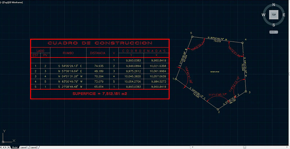 Con sólo tocar un polígono, calcula todos los datos necesarios para crear instantáneamente cuadros de construcción (rumbo, distancia, azimut, ángulos interiores, coordenadas y superficie). Se ofrecen dos tipos de cuadros y opciones para indicar número de decimales para cada dato, numeración de vértices en forma manual o automática con números o letras en forma horaria y contra-horaria y la opción de indicar vértice inicial. Al generar el cuadro de curvas, el programa anota la clave y puntos de inflexión en cada curva en forma global, reconociendo arcos y polilíneas con segmentos curvos. CivilCAD puede generar también cuadros de construcción con coordenadas UTM-GPS, incluyendo cálculo de factor de convergencia y escala lineal, latitud y longitud.